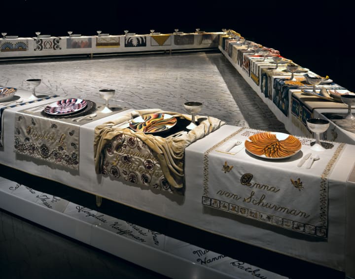 Another great work by Judy Chicago, The Dinner Party, depicts and reimagines the female role. In this piece, 39 place settings are set on the table honoring female figures in history and characters in mythology. Each plate is adorned with feminine attributes to symbolize the vagina, mother nature, and all life-giving properties women possess. Through this presentation, the original perception of women serving their love through meals (otherwise masking their qualities), captures the power in the gift women provide.