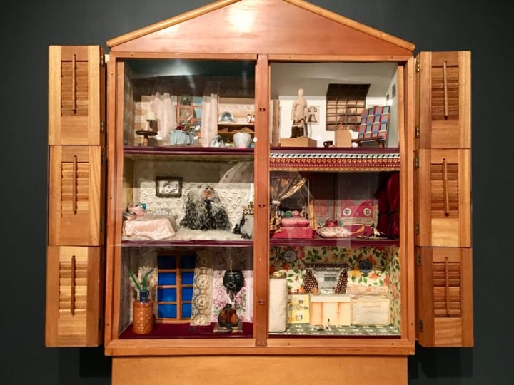 One of Miriam Schapiro’s major works, Dollhouse was featured in the Womanhouse project. In its physical makeup, 'Dollhouse' symbolizes what we all know to be a classic toy led by children's imagination as they learn how to role play. Schapiro further captures the aspects of a traditional "toy" as each room in the house serves to symbolize the many identities a women takes on. When the house is closed, all that is left to see is the wooden exterior—often depicting the ways in which society perceives a woman as one entity such as the homemaker. Another dimension to this sense of identity is added by displaying Dollhouse in Womanhouse serving as a house within a house—layers upon layers.