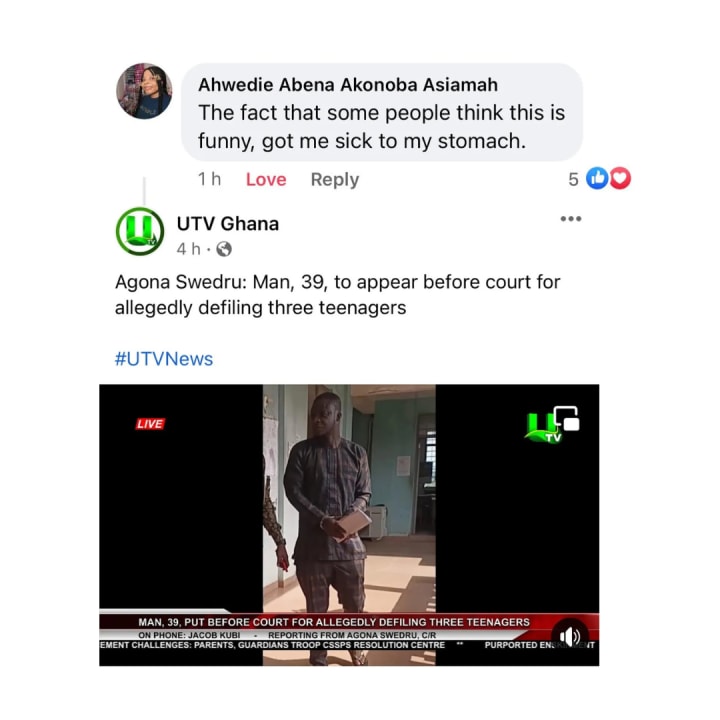 I've written about this before on other platforms, I have noticed it all over social media when Ghanaians talk about rape or sexual violence towards women and children, they laugh. I will never understand this and no one seems to care with the exception of very few people.
