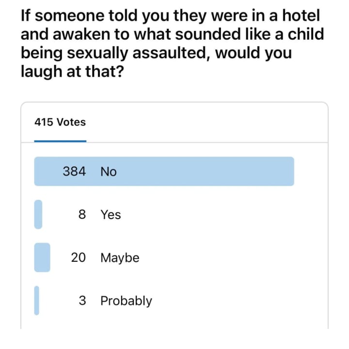This was a question I asked people on Reddit, this is what other people replied about being asked about sexual assault of a child. I had to see if it was normal to laugh at rape from people around the world.
