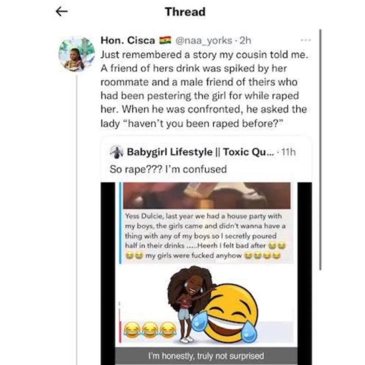 There on Twitter hundreds of Ghanaians thought this was funny, but what happened was several women posted about how they were raped too. I refused to take screenshots of them because they were using their real names and real accounts.