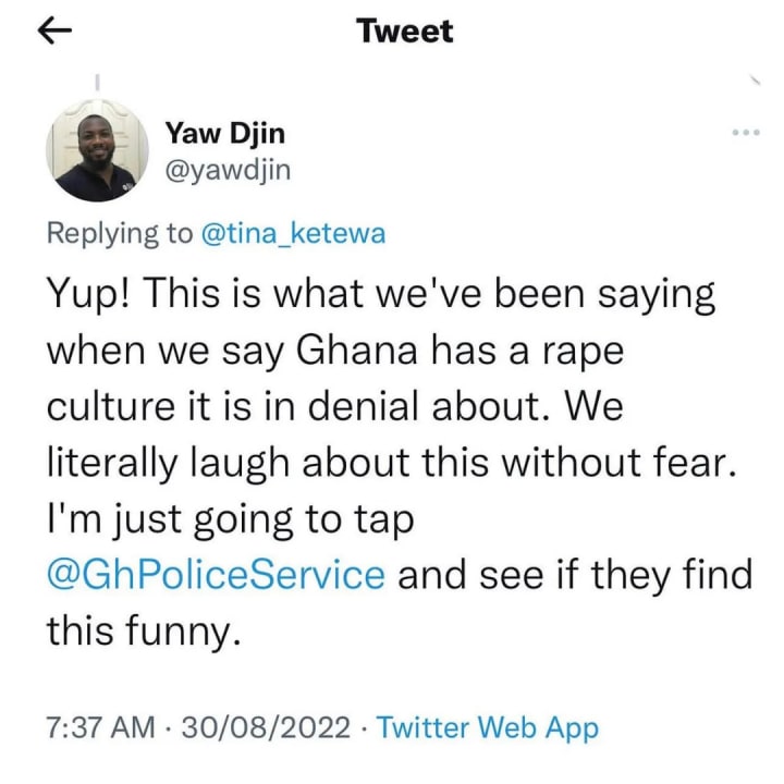 I asked this man why would Ghanaians constantly laugh at rape of children or women. His reply which I have in a voice note, "What do you expect them to do?" As he laughed so loudly and hard.
