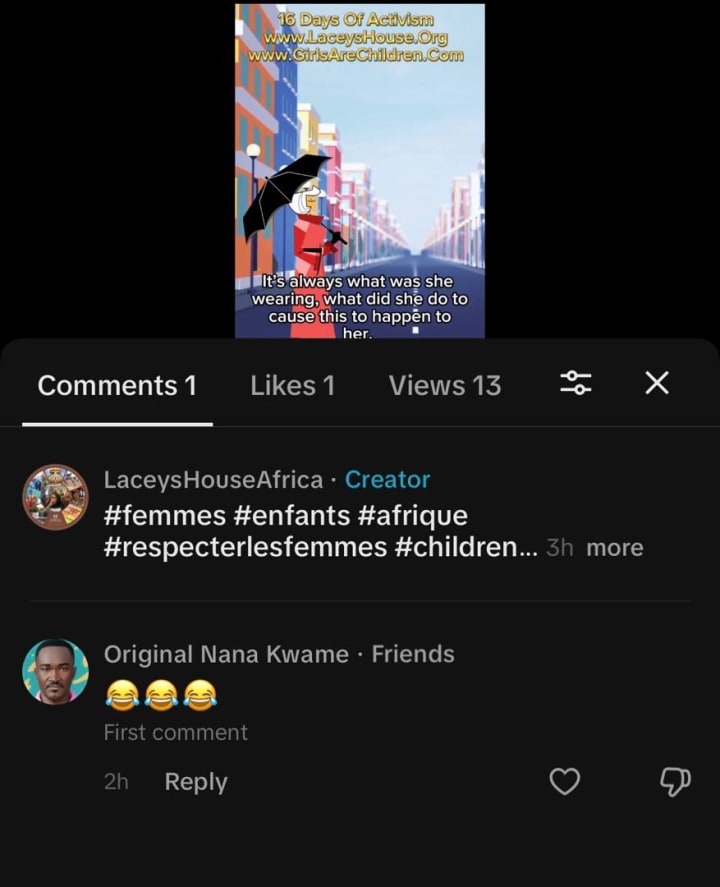 He thinks that the video was hilarious, I have yet to ask him why he left this as a comment. But as a Ghanaian man that admitted to raping a woman but didn't call it rape, he did say it was not right, he admitted that he pulled her into a backroom and took sex from her.