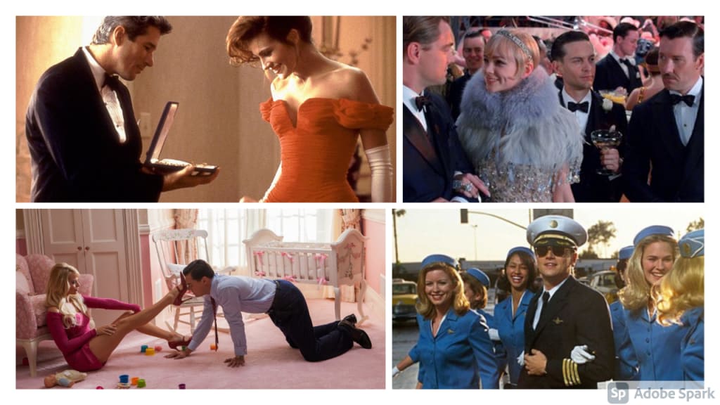 Movies are a great cultural resource where such paradigm is visible and the roles assigned to women in it are obvious. Just a few examples, ‘Pretty Woman’ (1990) – sex-wealth elements; ‘Great Gatsby’ (2013) – status-wealth element; a woman would be someone who goes into the equation once the first two elements are in place; ‘The Wolf of Wall Street’ (2013) – money-career-sex - all three are illustrated perfectly and the woman was entirely and purely for sex, though some elements of a family were mixed in; ‘Catch Me If You Can’ (2002) - money-sex – though, here the young man is also lost psychologically, but the elements of the paradigm are illustrated quite clearly. Some such movies are built entirely on the three elements, some have one or two made prominent and some have them woven into the story in a less prominent way.