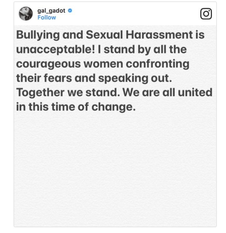 Gadot's condemnation speaks volumes to those who consider her a role model and for those women who have struggled with the aftereffects of physical or emotional trauma. This isn't the first time the actress has spoken about the need for change.