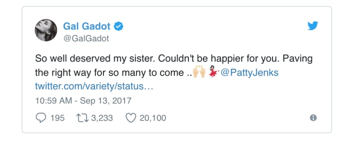 In a tweet, Gadot told Jenkins she was "paving the right way for so many to come."