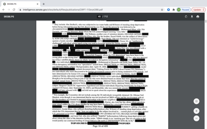 And there's more. When the exhaustive 6,000-page Senate Intelligence Committee report on torture was finally complete, after five years of investigation and research, Haines took charge of redacting it to deny the public's right to know its full details, reducing the document to a 500-page, black-ink-smeared summary. This censorship went beyond merely "protecting sources and methods"; it avoided CIA embarrassment, while ensuring her own career advancement.