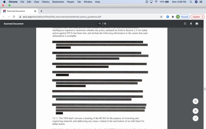 On page 4, the guidelines for drone strikes allow for lethal action against those who are not "high value targets," without explaining the criteria the CIA would use to identify someone as an imminent threat to the security of the United States. On page 12, the co-authors, Haines among them, redacted the minimum profile requirements for an individual "nominated" for lethal action. The very term "nominated" suggests an effort to sugarcoat targeted assassination, as though the bombing target were being recommended for a presidential Cabinet position.