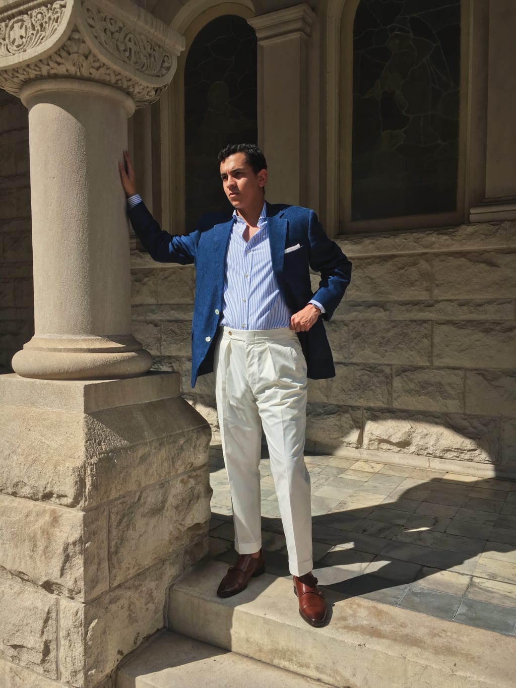 Instead, one should seek inspiration from the British collegiate sartorial tradition of the 1920s and 30s, where during the late fall and winter, a navy blazer and white flannel trousers were a de rigueur staple for the sporting gentleman on the campuses of Oxford and Cambridge. In addition, when the mercury actually does drop, and lighter fabrics may no longer be a practical option, one can definitely still make the case for adopting “winter whites,” or white, heavier cloths, i.e. a white pair of corduroy trousers or a cream, flannel, sport coat. As the master of your sartorial domain, there isn’t really a need to be bound by constraints of the calendar with your color palette. In short, meteorological practicality in one's dress, not adherence to the date, reigns.