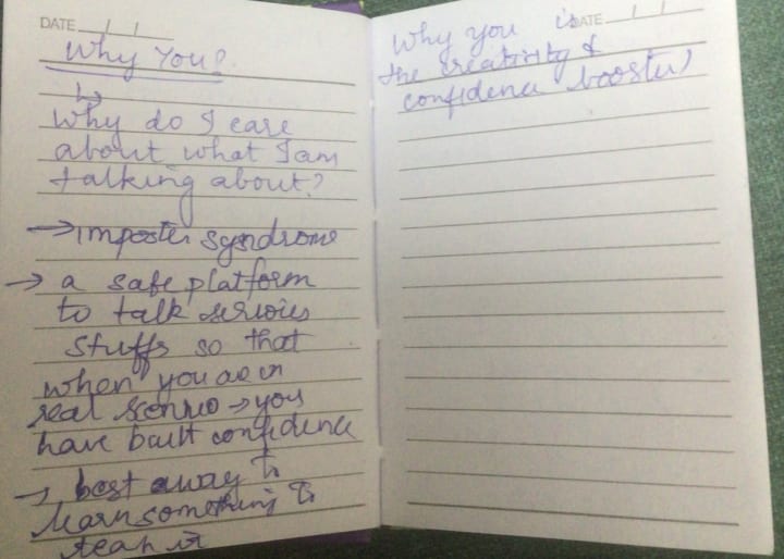 I would imagine what would be running in their minds while I was speaking. A little twitch from their end or change in voice would shut me off and send my inner-critic into a frenzy.When it came to voicing opinions in a formal setting, presenting my understanding of a technical subject to an audience that does not include my best friends, I realised I would rather jump off a bridge than take one more ridicule.