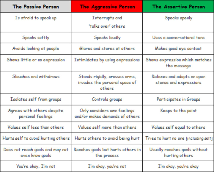 “Assertiveness is an interpersonal skill in which you demonstrate the healthy confidence to stand up for yourself while still respecting the rights of others. When you are assertive, you are neither passive nor aggressive, but direct and honest. You don't expect other people to know what you want, so you speak up to ask for what you need calmly and with confidence.” Inc.com