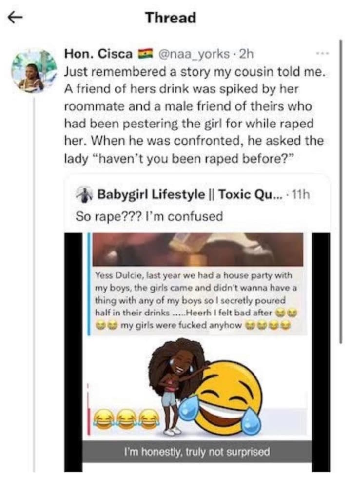 Sadly you can go onto any social media platform where there is news reported about rape, defilement, older men impregnating girls (Girls Are Children), most likely you'll find Ghanians laughing. It is common practice to laugh at rape, Ghanaian's claim this laughing is innocent. What human finds children and women getting raped funny?