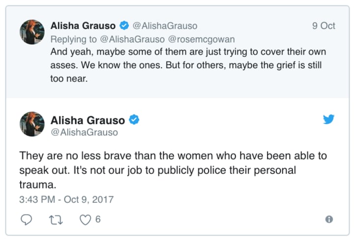 While reporters uncover even more allegations and the men in power try to hide their crimes, the most important thing we can ever do right now is to support the women who are coming forward and to let the ones that choose not to know it's all right to remain silent. Their silence does not constitute cowardice. It's self-preservation, and we should give them the respect these men never did.