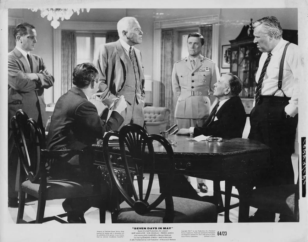 The plot begins with a nuclear pact between the United States and the Soviet Union. The president, played by Marche, is about to sign an agreement with the Soviet Union, in which both sides will destroy their nuclear materials and strike capabilities, and the world will return to a time before Oppenheimer and Einstein, when there was no Sword of Damocles. The Cold War, a state of communal confrontation, is nothing new in world history. But the difference is the existence of nuclear weapons -- a delicate balancing act, an almost delicate effort to walk on thin ice. Such a weapon of terror attached to both ends of the ideological scale formed the historical model of the Cold War. The disappearance of the nuclear bomb, like the Enlightenment, made justice no longer possible, and that was the liberation of mankind. It was with this understanding that the president reached this idealistic decision, which seemed to be for all humanity. General Scott, the military representative, did not believe that nuclear destruction would benefit the United States or humanity. They thought that if you trusted the Soviets for granted, you would be standing still in the extreme environment of bipolar politics. This is where the disagreement between the president and the military arises, and this is perhaps the crux of the film's problem -- American democracy, which claims to preserve universal enlightenment values, must in fact be made in the first place by the United States and its citizens. This is an awkward situation: there is no absolute universality, but American lives are more important than others. In fact, there is nothing wrong with this. It is a principle for nation-state communities to give priority to safeguarding their own interests and the interests of their citizens. But the film highlights the conflict over whether it is right for the popular Mr Lancaster to enforce military rule when the legitimate president does not uphold the principle of the national interest. Douglas's character externalizes the debate. His disapproval of the president's naivete and his absolute devotion to American constitutionalism set him on the opposite side of the general's intrigue. Under American constitutionalism, there is nothing wrong with that. If we really want to solve this dilemma, we must make clear the connotation of constitutionalism, and Karl Schmidt is the most profound critic of this kind.