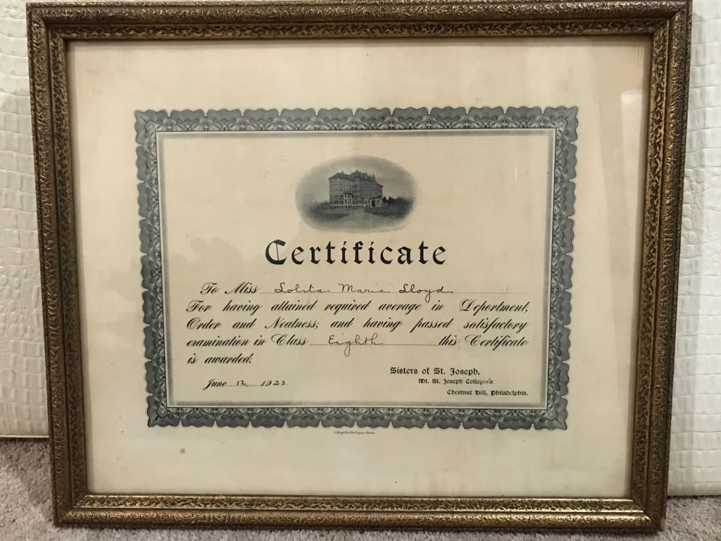 The same can be said of my most prized secondhand find of all, an 8th grade graduation certificate awarded in 1923 to a “Miss Lolita Maria Lloyd.” Its fascinating wording illuminates the way expectations for girls have changed in almost 100 years.