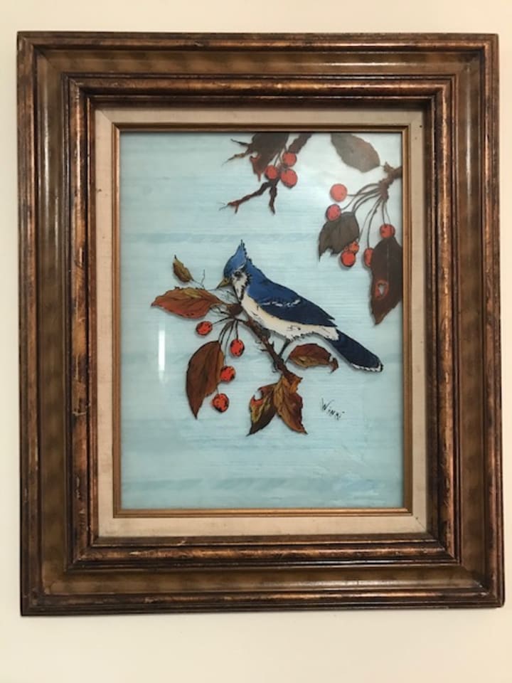 It’s got a tag on the back that says “Bluebird & Cherries by Thelma Winkelman.” I haven’t located the artist, but I dig her. It cost $20, which is a steal for fairly large original art with a custom frame.
