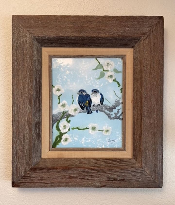 Here are some other blue birds. I bought this little find from a church shop over a decade ago in Phoenixville, Pennsylvania. I like how the image is done in glazed paint on pottery, but my favorite part of it is the stunning custom wood frame.
