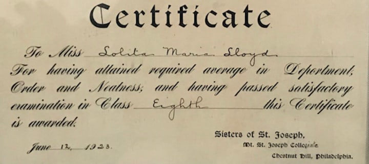 “To Miss Lolita Maria Lloyd For having attained required average in Deportment, Order, and Neatness, and having passed satisfactory examination in Class Eighth this Certificate is awarded.”