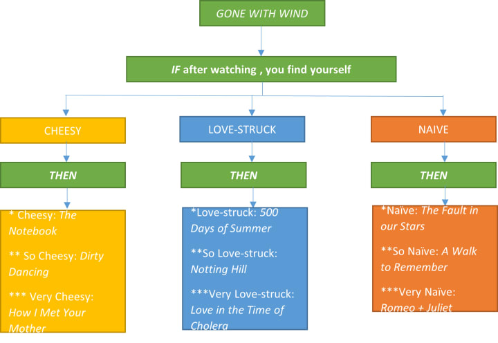 And of course, what better things to feed our sometimes insane thoughts of ideal love than the countless movies and TV shows that showcase love as that eternal, undying, enduring component of the human soul. Unfortunately, there is no single formula to give you a recommendation of what movies and TV shows to watch, especially since we all have our own likes and dislikes. Fortunately, I’m a nurse, and in our profession we like devising pathways that help succinct decision-making based on conditional “if-then” statements. Starting with the classic Gone With The Wind which showcases all that is cheesy, love-struck and naïve about love, the application of my professional experiences (ehem, ehem) should guide you along the way!