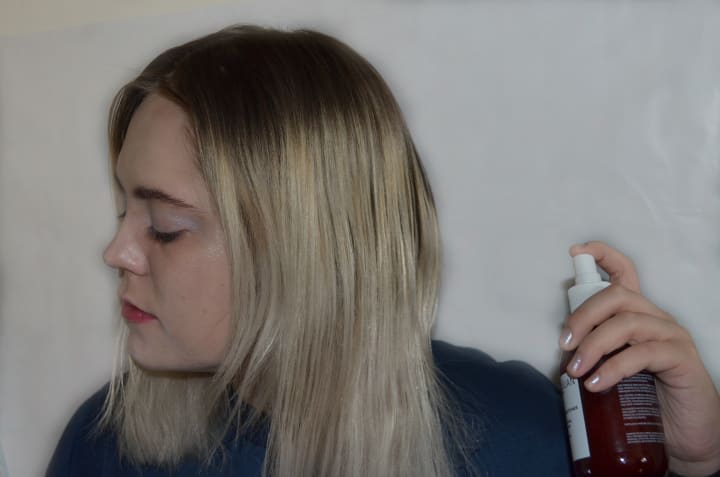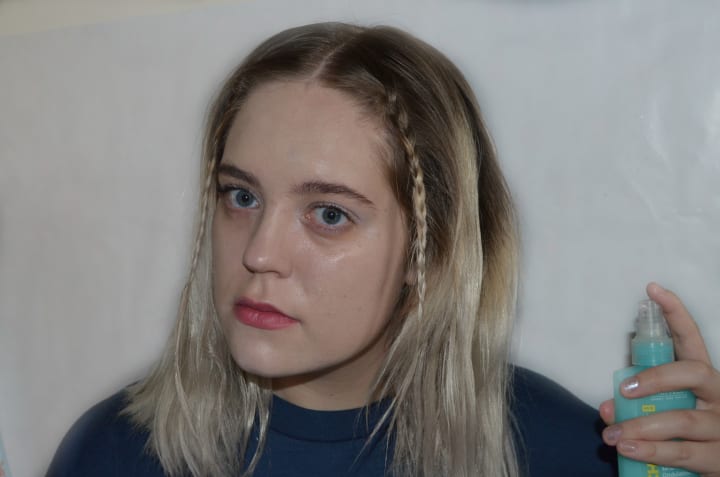 Then take the rest of your hair back down and spray it with a wave spray to add texture and movement. I love the John Frieda Beach Blonde for this, as it isn’t as drying for damaged hair like mine, plus it smells like beaches.