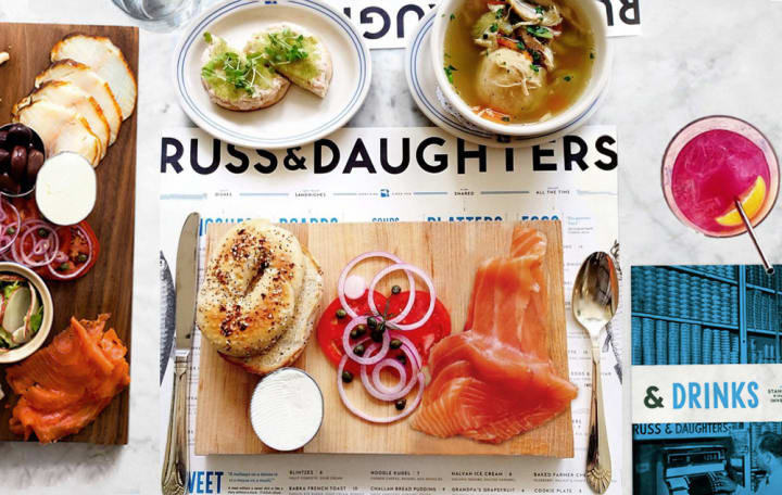 Russ & Daughters, a store dating back to 1914 on the historic Houston Street on the Lower East Side. The first thing you want to do when you step through the door is grab a ticket. Then take in all that’s around you while you wait: one counter offers smoked fish, caviar and shmears. Take a few steps down and you’ll see egg salad, tuna salad, eggplant salad and a selection of herring. On the other side, there’s a counter that offers tempting sweets like dried fruit, rugelach and babka. Or check out the cooler where you’ll find soups and some other pre-prepared items like latkes and blintzes. Along the wall you’ll see wire baskets holding bagels and bialys, some of the best the city has to offer. If you’d rather have crackers with your shmear, they carry those too. If you don’t want to deal with the hustle of the iconic location, check out there newly added restaurant just around the corner: Russ & Daughters Cafe.