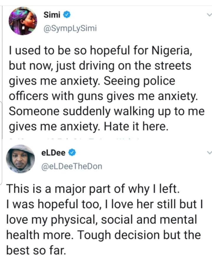 Earlier this year when fellow singer Simi tweeted saying, "I used to be so hopeful for Nigeria, but now, just driving on the streets gives me anxiety. Seeing police officers with guns gives me anxiety. Someone suddenly walking up to me gives me anxiety. Hate it here.", Eldee responded to the tweet saying: