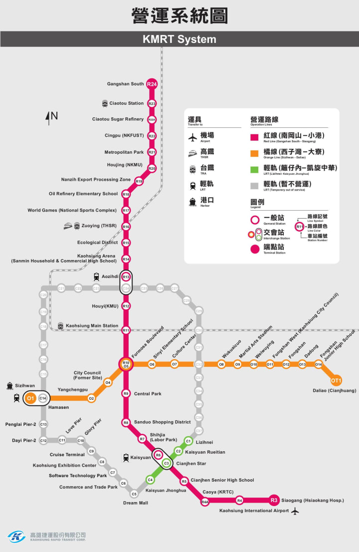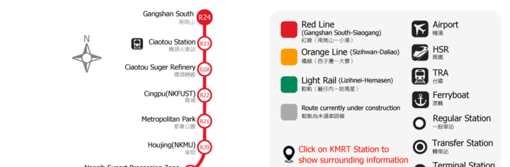 From Formosa Boulevard station (Red Line - R10) to Gangshan South (Red Line - R24) takes 32 minutes (10 minutes’ interval).