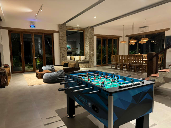 Our villa sat beneath a hillside, about 3–5 minutes by scooter from the beach. With 6 bedrooms, two outdoor Jacuzzis, and a full kitchen, we had everything we needed for two relaxing days and nights. There was even a large BBQ space and plenty of indoor seating for late-night chats and games.