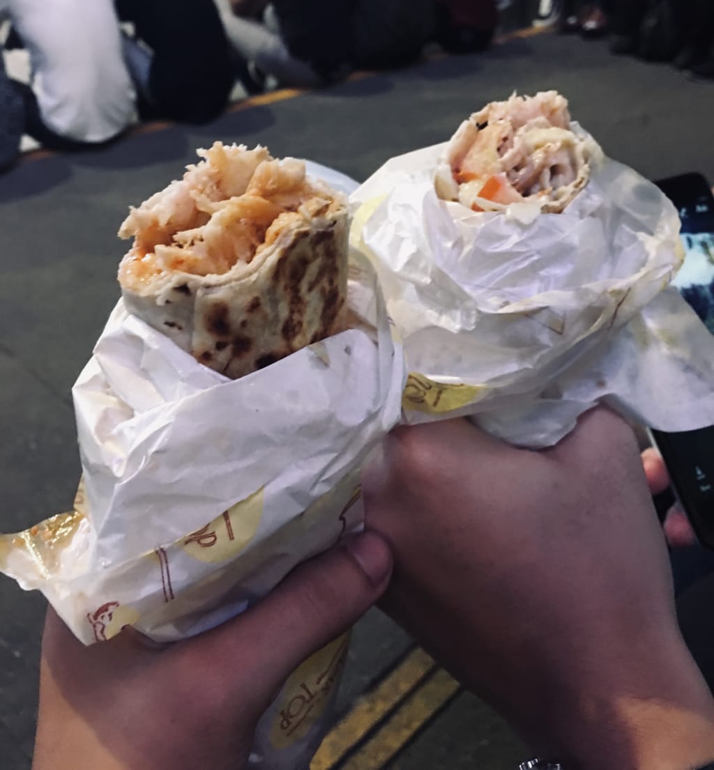 We buy ourselves two Malaysian burritos with the name I can never learn and two cones of McDonald’s ice cream. The food doesn’t make me cry as he promised. I don’t really love the taste, but I wouldn’t want to change a single thing about the feeling that comes along with it.