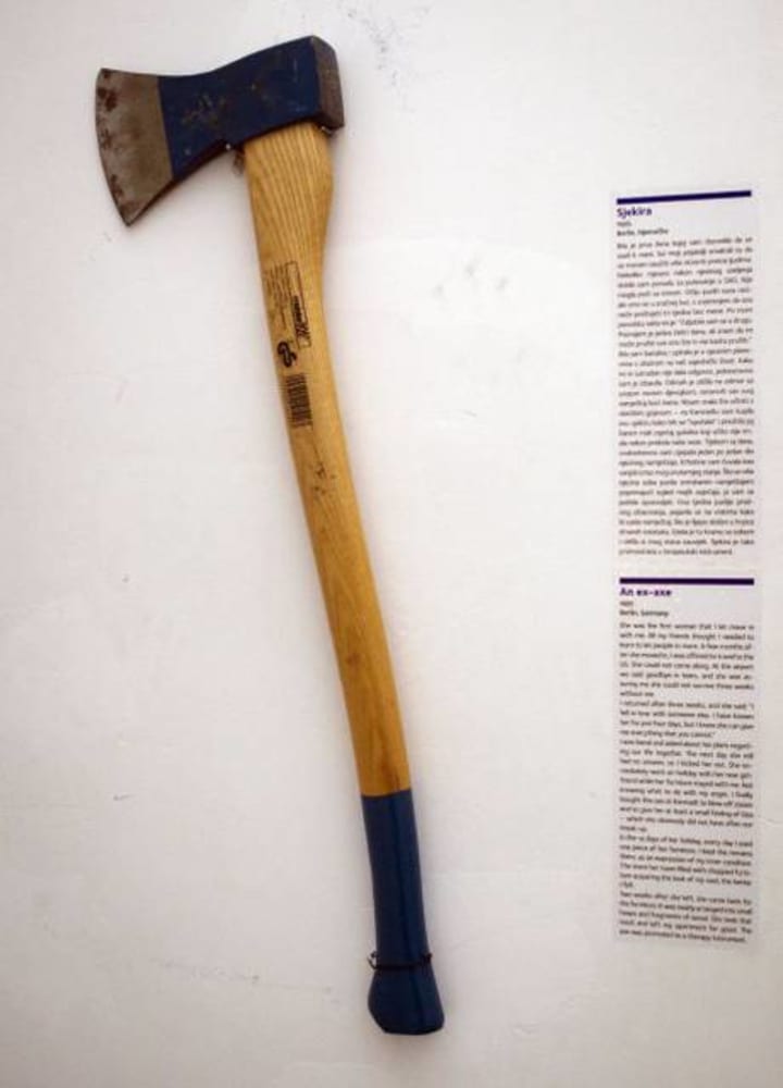 Note: despite the below photo of an “ex axe,” the museum emphasizes that it is NOT like some “destructive” self-help instructions on the internet for overcoming grief. Things like this ex axe are a TOTALLY HEALTHY way to heal and very representative of how normal people get over such things.