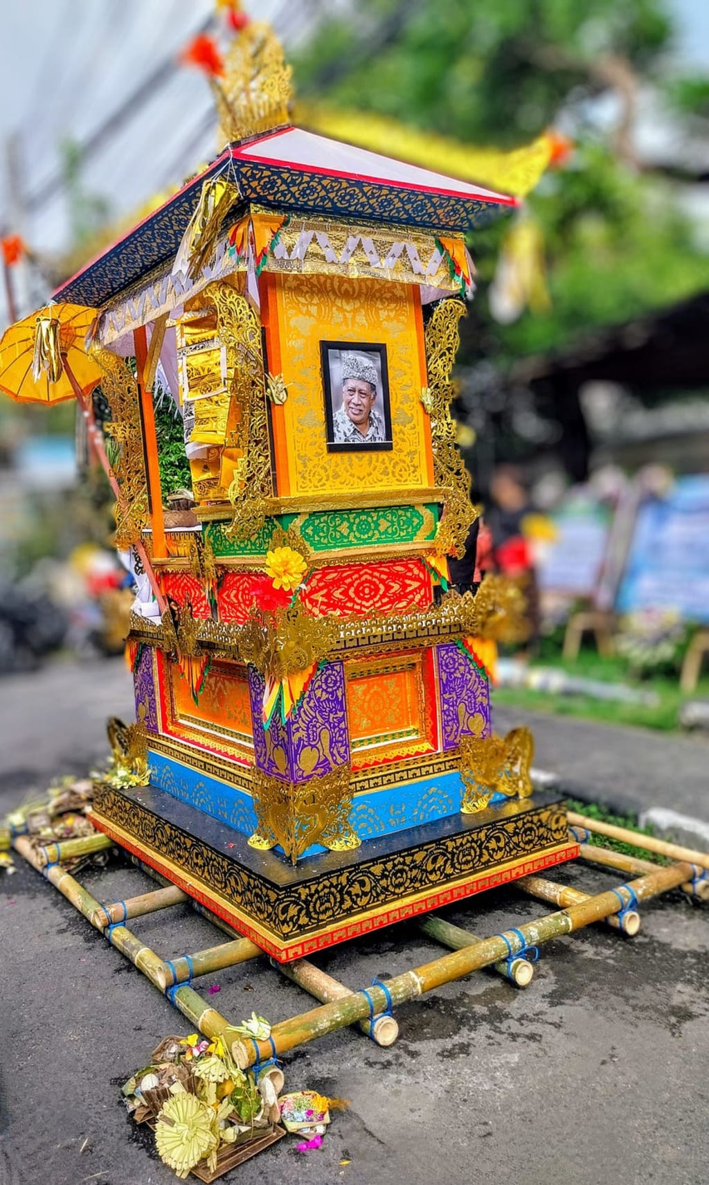 Traditions vary in different villages across the island. In some locations, a unique casket or sarcophagus is constructed in the shape of an animal, such as a bull, cow, lion, or deer, depending on the gender, caste, and status of the decedent. An animal-shaped sarcophagus was not used for this ceremony.
