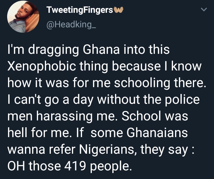 There was even a Ghanian claiming that in his area of Ghana they burn Nigerians alive. South Africans who've also been xenophobic to Nigerians oddly have reported to me they find it hard living in Ghana with discrimination.
