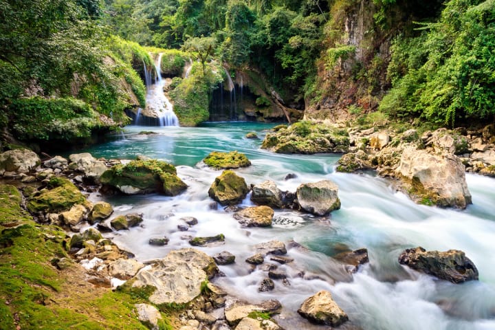 Semuc Champey lies deep in the jungle. Here a 300-meter limestone shelf creates natural pools in the river. There are great for swimming. All around is a dense forest with a variety of wildlife.