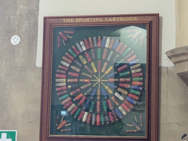 Behind the counter is a Sporting Cartridge Tophy made from spent shotgun cartridges. I don't know if it is for sale, but I expect that it is.