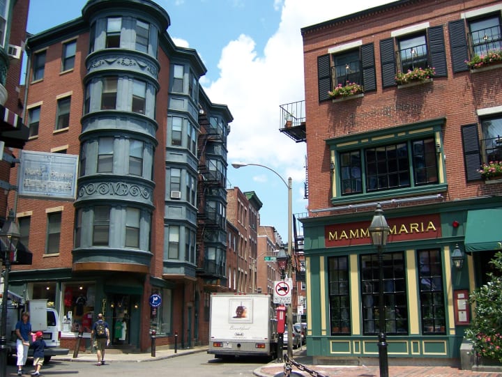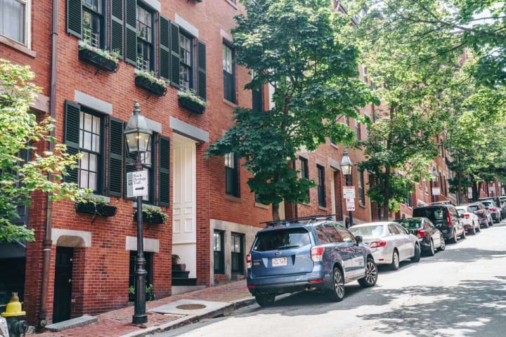 Beacon Hill is one of Boston’s most beautiful neighborhoods. The south side of this neighborhood has traditionally been the home of Boston’s “old money” families that are locally known as “Brahmins”. There are tree-shaded streets and brick homes in Federal and Greek Revival styles. At the very heart is Louisburg Square. Homes here face onto a leafy private park. Author Louisa May Alcott lived here from 1880 to 1888.