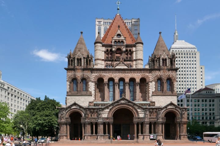 Facing the library across a grassy lawn is Trinity Church. This red sandstone building was designed by architect Henry Hobson Richardson in his distinctive style known as Richardson Romanesque. The murals, frescoes, and painted decorations inside the church were done by John La Farge.