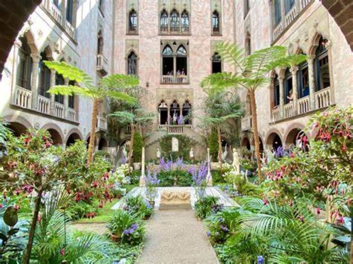 The Isabella Stewart Gardner Museum is housed in a building that was created after a 15th-century Venetian palace. The displays of collections are in rooms that are surrounded by a four-story central courtyard with flowering plants and fountains. There is a 2500-piece collection of paintings, sculptures, furniture, tapestries, decorative arts, books, and manuscripts that reflect the flamboyant taste of Mrs. Gardner.