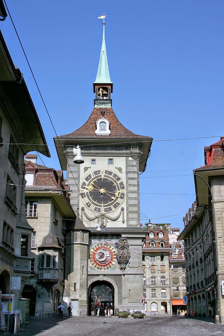 Another impressive clock tower is the Clock Tower – Zytglogge. This was the first western gate of the city. Its famous astronomical clock was built in 1530. It is one of the main attractions in Bern. When the hour chimes, the two-tower clocks, the mechanical figures and the astronomical clock are all driven by a common mechanism. The exterior of the clock has late-Baroque elements. The large dial is framed by a fresco created by Viktor Surbek in 1930.