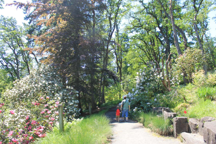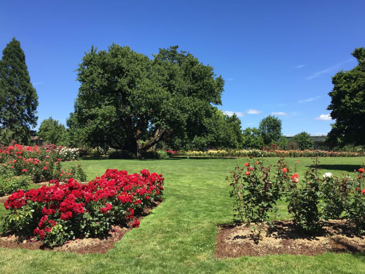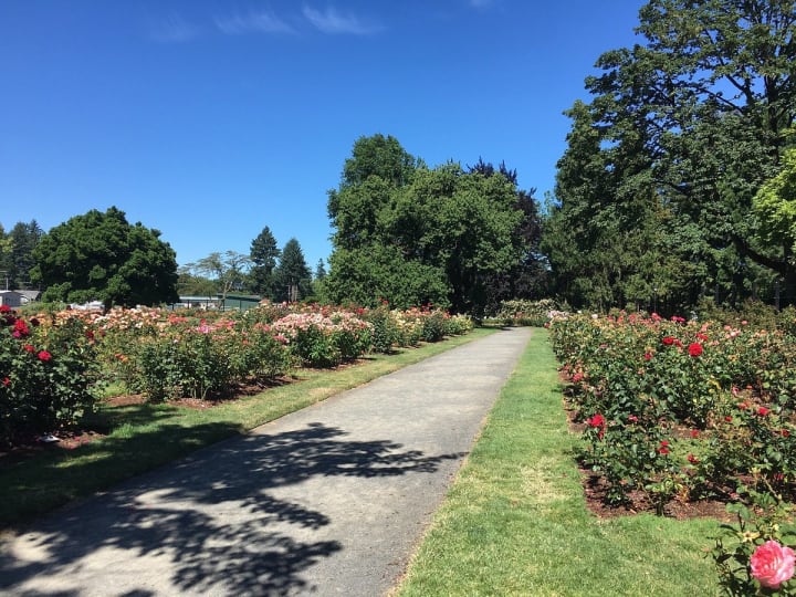 The Owen Rose Garden stretches near the shores of the Willamette River and the Washington-Jefferson Street Bridge. It has over 4,000 different roses. The garden has walking trails, picnic tables, and shelters that can be reserved.