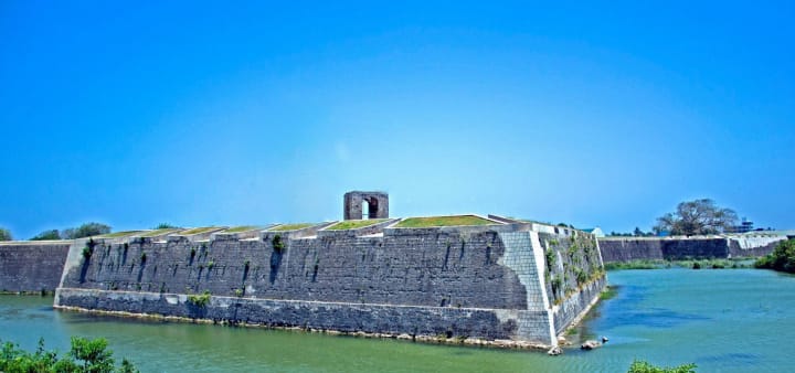Jaffna Fort stands overlooking the Jaffna lagoon. This was once one of the greatest Dutch forts in Asia. It has been recently restored but remains largely in ruins. The fort was built in 1680 over an earlier Portuguese original and defensive triangles were added in 1792 to produce the classic Vaubanesque star form. This citadel once housed thousands of troops and civilians. Still hidden beneath overgrown slopes you can see the walls of the fort constructed from coral, stone, brick, and mortar. During the war, government forces used the fort as an encampment.