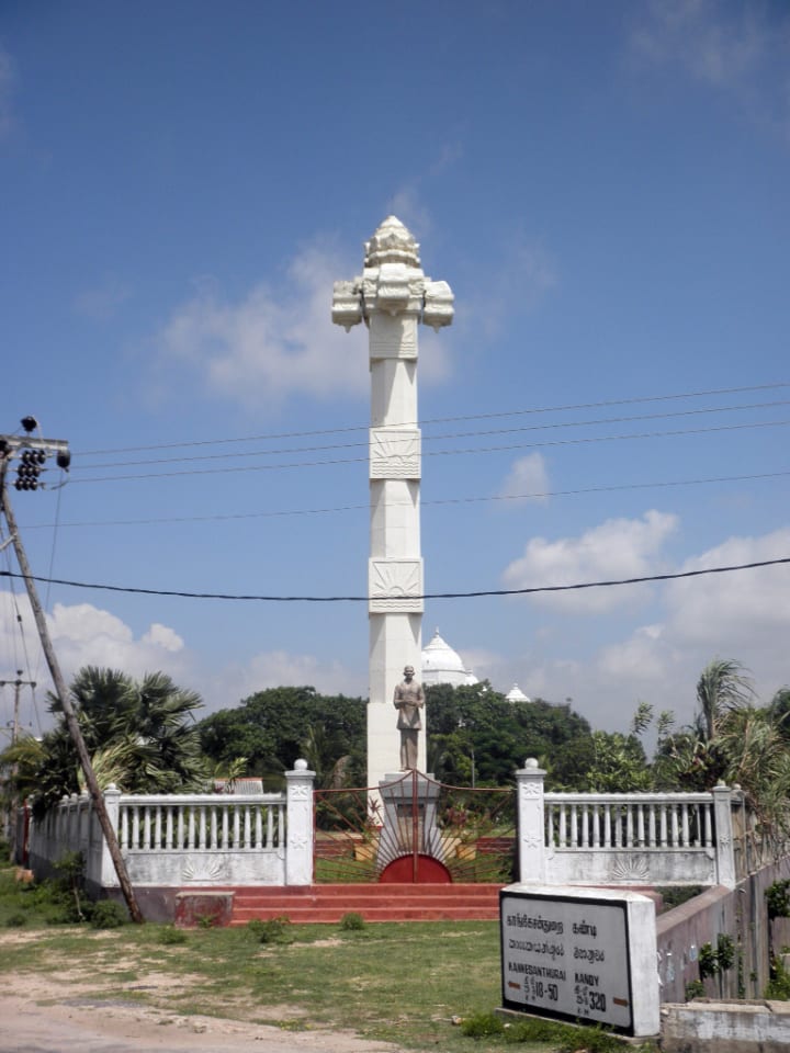 The SJV Chelvanayakum Monument is an unusual-looking top-heavy pillar erected near the Jaffna Library, celebrating the founder of the Tamil Federal Party. His statue stands beside the monument.