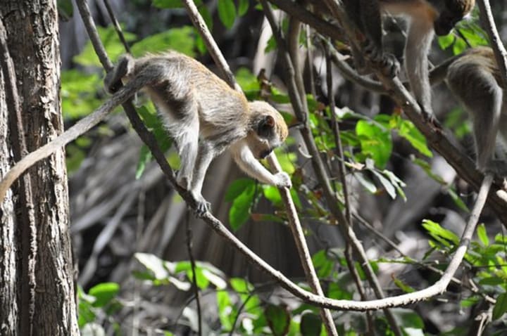 Bijilo National Park is home to various endangered species such as red colobus monkeys and birds like bee-eaters and hornbills. The park's well-maintained walking trails lead through lush vegetation, gallery forest, low bush, and grass towards the dunes.