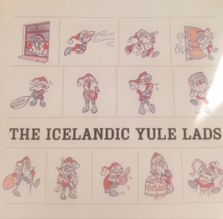 Icelandic folklore tells of thirteen mischievous brothers who leave their mountain home, one each day, starting on December 12. They visit farms and towns in search of holiday food to steal. They are the children of the cannibalistic trolls Grýla's and Leppalúð. Grýla was known to come down from the mountains on Christmas and boil naughty children alive.