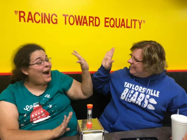 Robin (Randy's wife and co-owner wearing the red uniform sits with her customers and catches up. My son (who has Autism) is sitting in her lap. This is a great place to take kids who have trouble sitting still. The service is phenominal and the food is delicious!!!