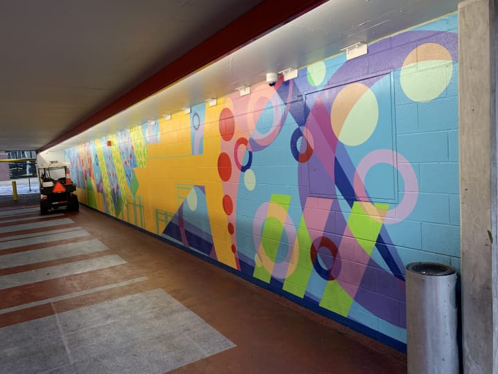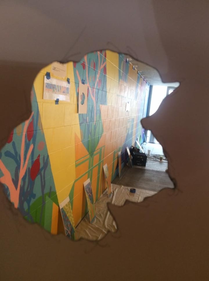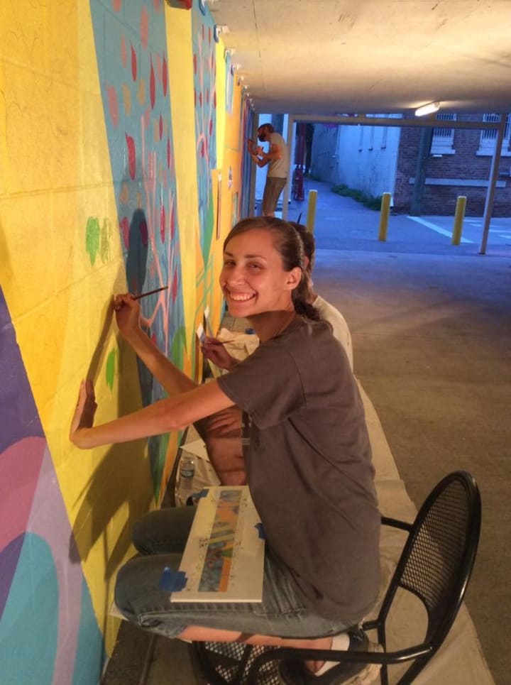 Everyone from her class helped lay the tape, And paint this mural in sections