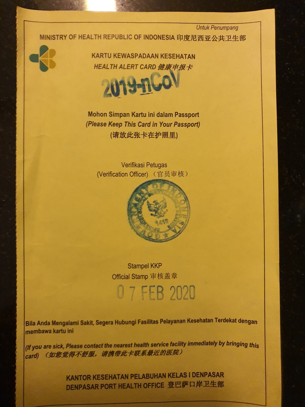 Upon arriving in Bali at the International airport we exited the plane and had standard arrival process. Being no over the top saftey precautions or delays due to the Corona Virus besides a small yellow slip of paper stating "If you are sick, Please contact the nearest health service facility immediately by bringing this card". (See picture attached)