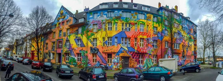 The Kiefernstrasse is an amazing street full of street art. Talented artists have created a very colorful street with fantastic paintings, patterns, shapes, and colors.