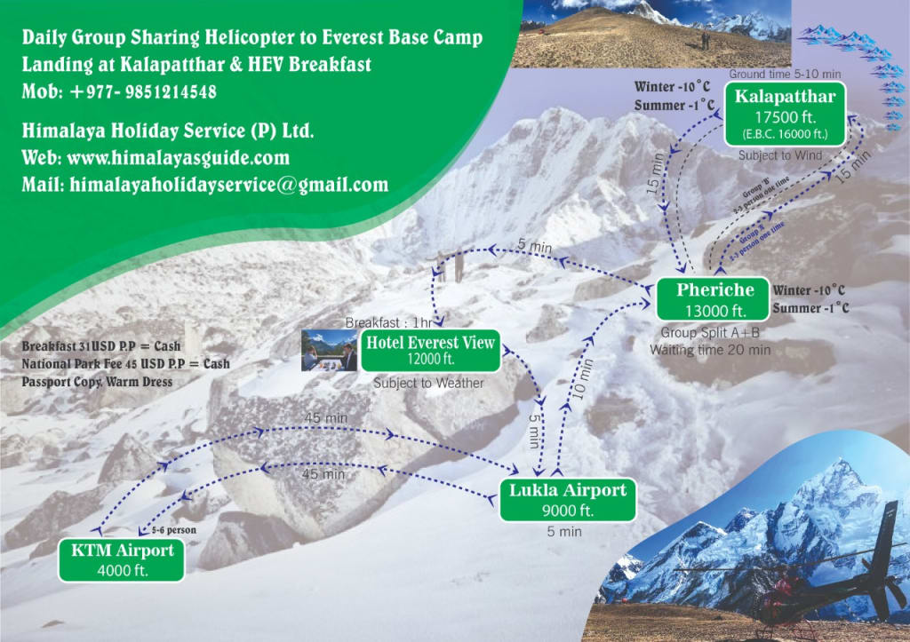 Himalaya Holiday Service Everest Helicopter Tour does not land at the Everest base camp, nor any helicopter companies. The landing at Everest Base Camp is not safe, due to its rough ground of rocks, moraine, and ice. In the past decades existed a temporary Helipad, but gets washed by the movement of glaciers, rock falls, and frequent avalanches. The other big reason is not eco-friendly it will cause disturbance in beautiful natural wonderful locations. The base camp is made of fragile ice, snow, and glaciers; the noise and sound of propellers. As well the main rotor blades will destroy the tranquilness of the pristine surroundings.