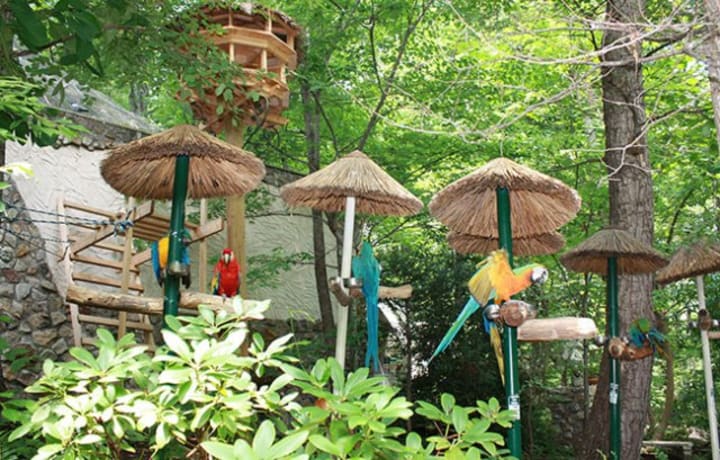 Parrot Mountain and Gardens is a bird park and garden in Pigeon Forge where parrot cottages line the paths. The tropical birds sit on open perches or fly overhead. Visitors can feed the birds from their hands, take photos with them, or just stroll through the gardens. There is a baby bird nursery on-site and you can purchase a bird to take home.