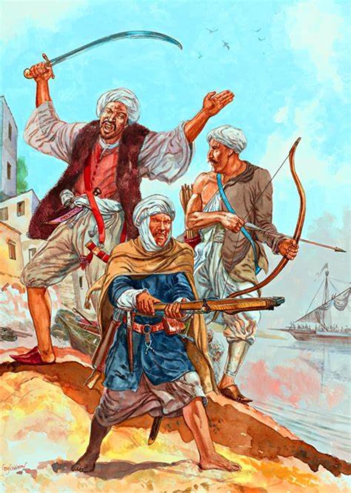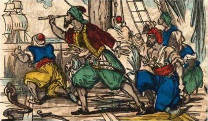 Barbary pirates were known across the Mediterranean and beyond. The author of the classic novel “Don Quixote”, Miguel de Cervantes was apprehended by Barbary pirates. He was held captive in Algiers for five years in the late 1500s. The First Barbary War started when both Thomas Jefferson and George Washington were looking into the problem of Barbary pirates attacking American ships.